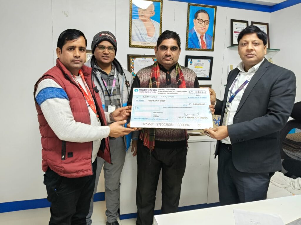 महराजगंज आजमगढ़ महाराजगंज थाना क्षेत्र के रहने वाले संतोष जायसवाल की पत्नी का भारतीय स्टेट बैंक की अक्षयवट शाणा में बचत खाता था। विगत दिनों विन्दू की बीमारी से प्रसामयिक मृत्यु हो गयी । संतोष जब अपनी मृतक पत्नी के खाते का क्लेम करने बैंक गए तो बैंक वालों ने बताया की आपकी पली का प्रधानमंत्री जीवन ज्योति बीमा के तहत बीमा चल रहा है। पति को इस बात की कोई भी जानकारी नहीं थी । इसके बाद बैंक के द्वारा जरुरी कागजात लेने के बाद । हफ्ते के अन्दर बीमा राशि 2 लाख का चेक प्रदान किया गया। SBI अक्षयवट के शाणा प्रबंधक अरविन्द भादव से बताया कि प्रधानमंत्री की महवाकांक्षी योजना PMSBY और PMJJBY बहुत की कम प्रीमियम दो लाख का बीमा कवर उपलब्ध करवाती है। सालाना 20 रुपये है प्रीमियम पर PMSBY के तहत २लाण एक्सीडेंटल मृत्यु पर तथा 436 रूपये प्रीमियम पर PMJJBy के तहत प्राचेतक मृत्यु पर 2 लाख का बीमा कवर प्रदान किया जाता है। चेक प्रदान के दौरान शाखा प्रबंधक अरविंद यादव, फील्ड आफिस से पुनीत कुमार, बैंक के कर्मचारी मौजूद रहे।