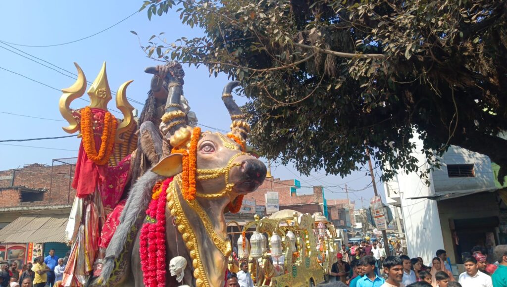 महराजगंज आजमगढ़ महाराज नगर स्थित भैरव धाम से भगवान शिव की भव्य बारात श्रद्धा और उल्लास के साथ निकाली गई। ‘हर-हर महादेव’ और ‘बम-बम भोले’ के जयकारों से पूरा क्षेत्र गूंज उठा |शिवभक्तों की भारी भीड़ ने पूरे वातावरण को भक्तिमय बना दिया| बारात में शामिल श्रद्धालु डीजे की धुनों और भक्ति गीतों पर झूमते नजर आए|शिव बारात में भगवान शिव, माता पार्वती, गणेश, कार्तिकेय सहित विभिन्न देवी-देवताओं की आकर्षक झांकियां सजाई गई थीं, जिन्होंने सभी का मन मोह लिया| विशेष रूप से शिव तांडव और भगवान शिव पार्वती के नंदी पर बैठे बारात लेकर जाते हुए झांकी आकर्षण का केंद्र रही| छोटे-छोटे बच्चों ने भी भगवान शिव, नंदी और गणों का रूप धारण कर कार्यक्रम की शोभा बढ़ाई | बारात भैरव धाम से प्रारंभ होकर नगर के प्रमुख मार्गों से होती हुई बजरंग चौक, पंडित लक्ष्मीकांत चौक होते हुए सहदेवगंज चौक के रास्ते थाना परिसर पहुंचा| जहां प्रभारी निरीक्षक केदारनाथ मौर्य नेये बारातिओं का स्वागत किया |पुनः मंदिर परिसर में पहुंची, जहां आरती और प्रसाद वितरण का आयोजन किया गया। रास्ते में विभिन्न स्थानों पर श्रद्धालुओं द्वारा पुष्प वर्षा कर बारात का स्वागत किया गया।आदि पुरुष भगवान शिव और आदिशक्ति के परिणय संस्कार का महापर्व शिवरात्रि संसार में धर्म, नैतिकता, मानवता की स्थापना तथा प्रकृति व शक्ति का अद्भुत संयोग है |शादी समारोह में ब्रम्हा, विष्णु सहित कई देवताओं के किरदार में कलाकारों ने अपनी प्रस्तुति दी| शिव बारात पुलिस की कड़ी सुरक्षा व्यवस्था में निकाली गयी| बारात भ्रमण के दौरान हर चौक चौराहों सहित रास्तों पर भी पुलिस बल तैनात रही और यातायात व्यवस्था को सुचारु बनाए रखा| आयोजकों ने बताया कि हर वर्ष की भांति इस वर्ष भी शिव बारात का आयोजन हर्षोल्लास और शांति के साथ सम्पन्न हुआ|शिव बारात ने पूरे नगर में आध्यात्मिक ऊर्जा का संचार कर दिया |