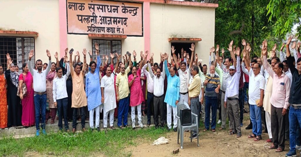 आजमगढ़ । प्रदेशीय नेतृत्व के आह्वान पर शिक्षक शिक्षामित्र अनुदेशक कर्मचारी संयुक्त मोर्चा, उत्तर प्रदेश की जिला इकाई के तत्वाधान मेंं शिक्षा क्षेत्र पल्हनी के शिक्षक/शिक्षिकाओं/अनुदेशक/शिक्षामित्रों द्वारा अव्यवहारिक डिजिटल/ऑनलाइन उपस्थिति के विरोध में कार्यालय खण्ड शिक्षा अधिकारी पल्हनी, के परिसर में प्रदर्शन किया । प्राथमिक शिक्षक संघ के ब्लाक अध्यक्ष डा राजेश कुमार सिंह ने कहा कि हम ऑनलाइन उपस्थिति के विरोध में नहीं है, किन्तु सरकार द्वारा हमारी वर्षों से लम्बित मांगों पर विचार नहीं किया जा रहा है, तथा जबरन डिजिटल उपस्थिति हेतु दबाव बनाया जा रहा है। हमारी मांगां में 15 सीएल, 15 हॉफ सीएल, 30 ईएल, राज्य कमर्चारी का दर्जा, सपरिवार चिकित्सा सुविधा, प्रमोशन विद्यालयों में लिपिक की तैनाती, पदोन्नति तथा 30 किमी0 की परिधि में अध्यापकों की तैनाती आदि समस्या का निराकरण किया जाना आवश्यक है। सरकार जब तक हमारी मांगो को पूरी नहीं करती है, तब तक हम डिजिटल उपस्थिति का विरोध करते रहेंगे। आगामी 15 जुलाई, 2024 को मेहता पार्क, आजमगढ़ के परिसर में अपराह्न 1 बजे जनपद के सभी शिक्षक/शिक्षिकाएं उपस्थित होकर मुख्यमंत्री को संबाधित ज्ञापन डीएम को सौंपेंगे। प्रदर्शन में मुख्य रूप से बंशबहादुर सिंह महामंत्री, जूनियर शिक्षक संघ, संजय सिंह, (ब्लाक अध्यक्ष, जूनियर शिक्षक संघ), अवधराज सिंह, (वरिष्ठ उपाध्यक्ष), सन्तोष राय, (मंत्री), तरूणेश सिंह, देवेन्द्र प्रताप सिंह, अनिल कुमार राय, जितेन्द्र यादव, इन्द्रासन पाण्डेय, दिनेश सिंह, अरूण कुमार त्रिपाठी, श्रीमती कंचनलता मौर्या, श्रीमती प्रतिमा सिंह, श्रीमती कुसुम सिंह, श्रीमती इन्द्रावती सिंह, श्रीमती रिंका त्रिपाठी, श्रीमती सुधा, श्रीमती नीलम सिंह, श्रीमती सीमा राय, श्रीमती आशा सिंह, श्रीमती आभा राय, रकसिन्दा खान, साबिस्ता रहमत आजमी, वकार अहमद, मो0 काजी अकील, मो0 महबूज आदि सैकड़ों शिक्षक/शिक्षिकाएं उपस्थित रहे।