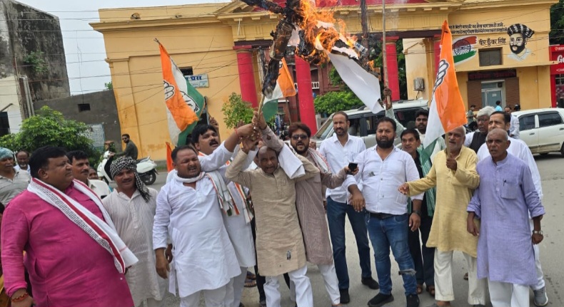 आजमगढ़ में भाजपा नेता अनुराग ठाकुर के बयान पर कांग्रेसियों में उबाल, पुतला फुंका, किया प्रदर्शन