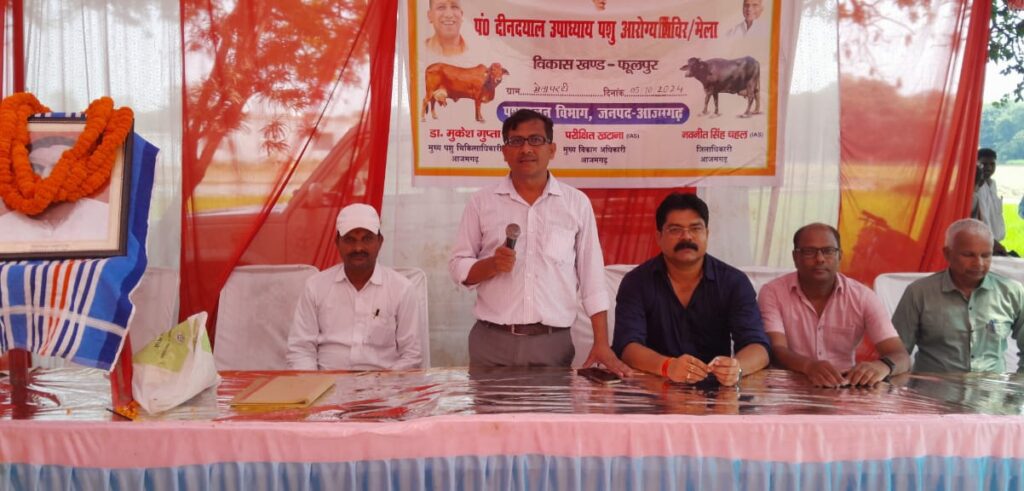 मार्टीनगंज आजमगढ़ विकास खंड फूलपुर क्षेत्र के खेतापट्टी गांव में शनिवार को पं0दीनदयाल उपाध्याय पशु आरोग्य शिविर/मेला का आयोजन किया गया ।शिविर का शुभारंभ पं0दीनदयाल उपाध्याय के चित्र पर पुष्प अर्पित कर किया गया। इस अवसर पर उप मुख्य पशु चिकित्साधिकारी डाॅ अनिल वर्मा , तथा पशु चिकित्साधिकारी डाॅ आलोक सिंह पालीवाल ने पशुओं में होने वाली बीमारियों तथा बाझपन चिकित्सा आदि के बिषय में विस्तृत जानकारी पशुपालकों को दी । शिविर में पशुपालकों को कीड़ी,किलनी, मिनरल मिक्स्चर पावडर दिया गया साथ ही साथ पशुओं को एल एस डी डिजीज का टीकाकरण भी किया गया । इस अवसर पर तीन पशुओं का बीमा भी किया गया । कुल 680पशुओं का शिविर में पंजीकरण किया गया जिसमें 305बड़े पशु तथा 375छोटे पशु थे जिनके पशुपालकों को विभिन्न लाभकारी योजनाओं की जानकारी दी गई । इस अवसर पर राम सुरेश यादव पशुधन प्रसार अधिकारी, विक्रमा प्रसाद, वीरेंद्र मौर्या, मनीष सिंह बंटी ग्राम प्रधान, बबलू सिंह, डाॅ मेवालाल एम्बुलेंस के अलावां शशिभूषण सिंह, रमाकांत सिंह, आनंद कुमार सिंह, रोहित सिंह, रामदवर, राम दयाल, रामू राजभर, संजय राजभर, अमर बहादुर राजभर आदि पशुपालक उपस्थित थे।