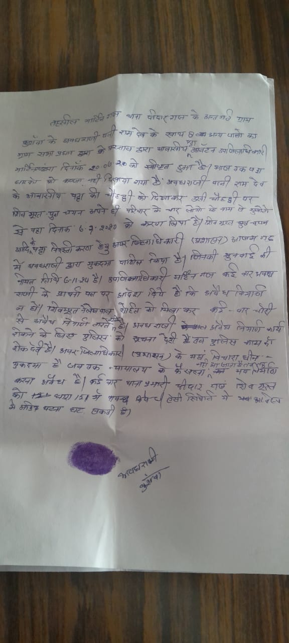मार्टीनगंज आजमगढ़ मार्टिनगंज तहसील के दीदारगंज थानान्तर्गत कुशवां गांव निवासिनी अवधराजी पत्नी रामदेव के साथ आठ अन्य पात्रों का ग्राम प्रधान के प्रस्ताव पर आवासीय पट्टा आवंटन उपजिलाधिकारी मार्टिनगंज द्वारा 20जून 2020को स्वीकृत हुआ है।परंतु आजतक पट्टा धारकों को कब्जा नहीं दिलाया गया है। अवधराजी पत्नी रामदेव के आवासीय पट्टा की चौहद्दी को दिखाकर उसी चौहद्दी पर शिवमूरत पुत्र चयन अपने ही परिवार के चार लोगों के नाम से सुमोटो से 6जुलाई 2020को पट्टा करवा लिया है। शिवमूरत पुत्र चयन आदि के पट्टा निरस्तीकरण हेतु अपर जिलाधिकारी (प्रशासन)आजमगढ़ में अवधराजी द्वारा मुकदमा दाखिल किया गया है। जिसकी सुनवाई की नीयत तिथि 6नवम्बर 2024है। उपजिलाधिकारी मार्टिनगंज कईबार अवधराजी के प्रार्थना पत्र पर आदेश दिए हैं कि अवैध निर्माण न हौ। शिवमूरत ने लेखपाल रोहित को मिलाकर कई बार चोरी से अवैध निर्माण करते रहते हैं। अवधराजी अवैध निर्माण कार्य रोकने के लिए पुलिस को सूचना देती है तब पुलिस काम को रोक देती है। अपरजिलाधिकारी प्रशासन के यहां विचाराधीन मुकदमा है जबतक न्यायालय का फैसला नहीं आ जाता है तबतक नव निर्माण करना अवैध है। कई बार थाना प्रभारी दीदारगंज शिवमूरत को धारा 151में पाबंद कर चुके हैं ऐसी स्थिति में भविष्य में अप्रिय घटना घट सकती है।