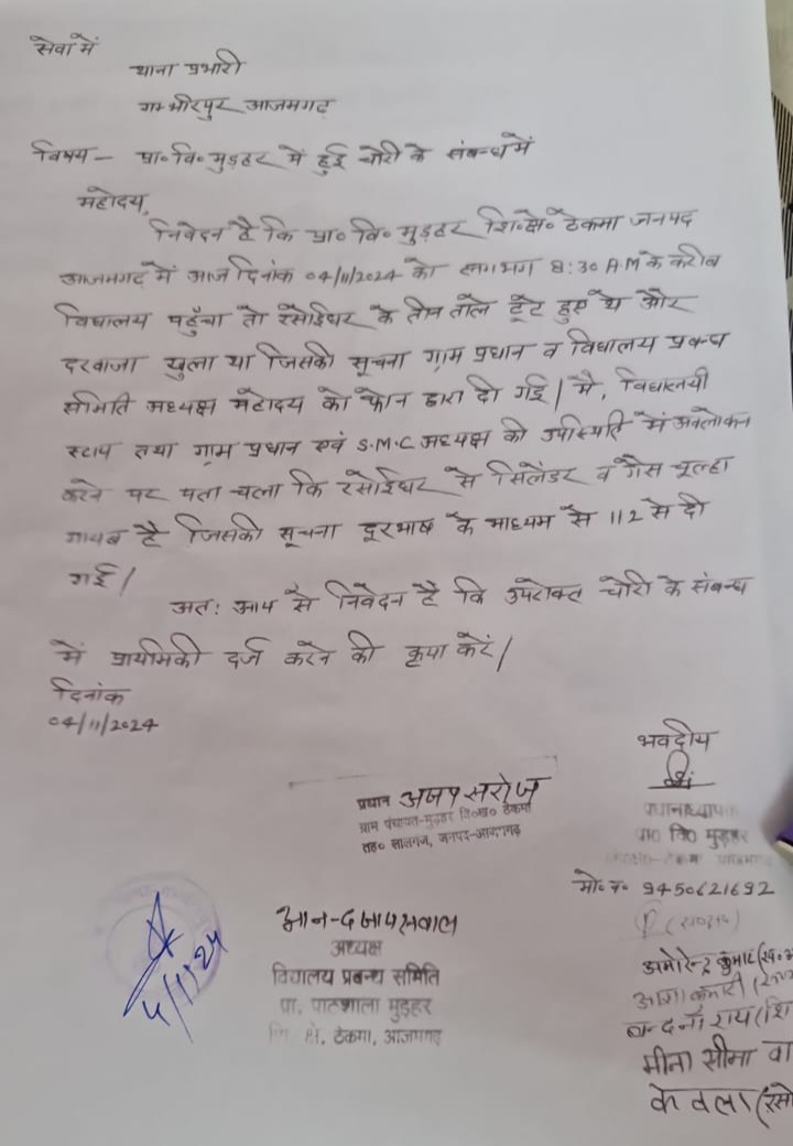 फरिहा आजमगढ़ गंभीरपुर थाना क्षेत्र एवं शिक्षा क्षेत्र ठेकमा के प्राथमिक विद्यालय मुड़हर में अज्ञात चोर रसोईघर का ताला तोड़कर उसके अंदर रखा सिलेंडर व गैस चूल्हा लेकर फरार हो गए। इसके संदर्भ में विद्यालय के प्रधानाध्यापक ने गंभीरपुर थाने में तहरीर दी है। जानकारी के मुताबिक धनतेरस दीपावली का अवकाश होने पर विद्यालय के अध्यापक विद्यालय बंद करके अपने घर चले गए कई दिन के अवकाश के बाद सोमवार को शिक्षा क्षेत्र ठेकमा के प्राथमिक विद्यालय मुडहर के प्रधानाध्यापक विद्यालय पहुंचे तो उन्होंने रसोई घर का ताला टूटा हुआ देखा उन्होंने इसकी सूचना तुरंत ग्राम प्रधान, वह पीआरबी 112 को दिया सूचना पर पहुंची गंभीरपुर पुलिस जांच पड़ताल मे जुट गई। प्रधानाध्यापक ने अज्ञात चोरों के खिलाफ गंभीरपुर थाने में तहरीर दी है।