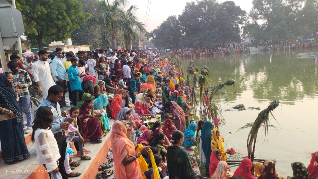 मुबारकपुर आजमगढ़ सुर्य उपासना का महान पर्व डाला छठ गुरुवार को नगर सहित ग्रामीण अंचलों में बड़े ही हर्षोल्लास के साथ शांतिपूर्ण से सूर्य देव भास्कर को देखकर व्रती महिलाओं ने पुत्र दीर्घायु के साथ ही जगत कल्याण की कामनाएं की उक्त महान पर्व नगर के थाना स्थित पोखरें के ठीक सामने,समौधी स्थित कच्चा पोखरें पर शाम होते-होते पाव रखने की कहीं जगह नहीं रही लोगों द्वारा सप्ताह पूर्व से ही अपने-अपने वेदियों को बनाने एवं जगह सुरक्षित करने का कार्य बदस्तूर जारी रहा किसके साथ हुई विभिन्न प्रकार के फलों सहित भास्कर दीनानाथ को विभिन्न प्रकार के व्यंजनों को साफ सुथरे स्थान पर बनाया गया सुरक्षा की दृष्टि से निहारनंदन कुमार एवं चौकी प्रभारी मुरारी मिश्रा ने क्षेत्र का भ्रमण करने और घाटों का निरीक्षण करने लोगों को अधिक पानियों में न प्रवेश करने का सुझाव देते देखा गया।