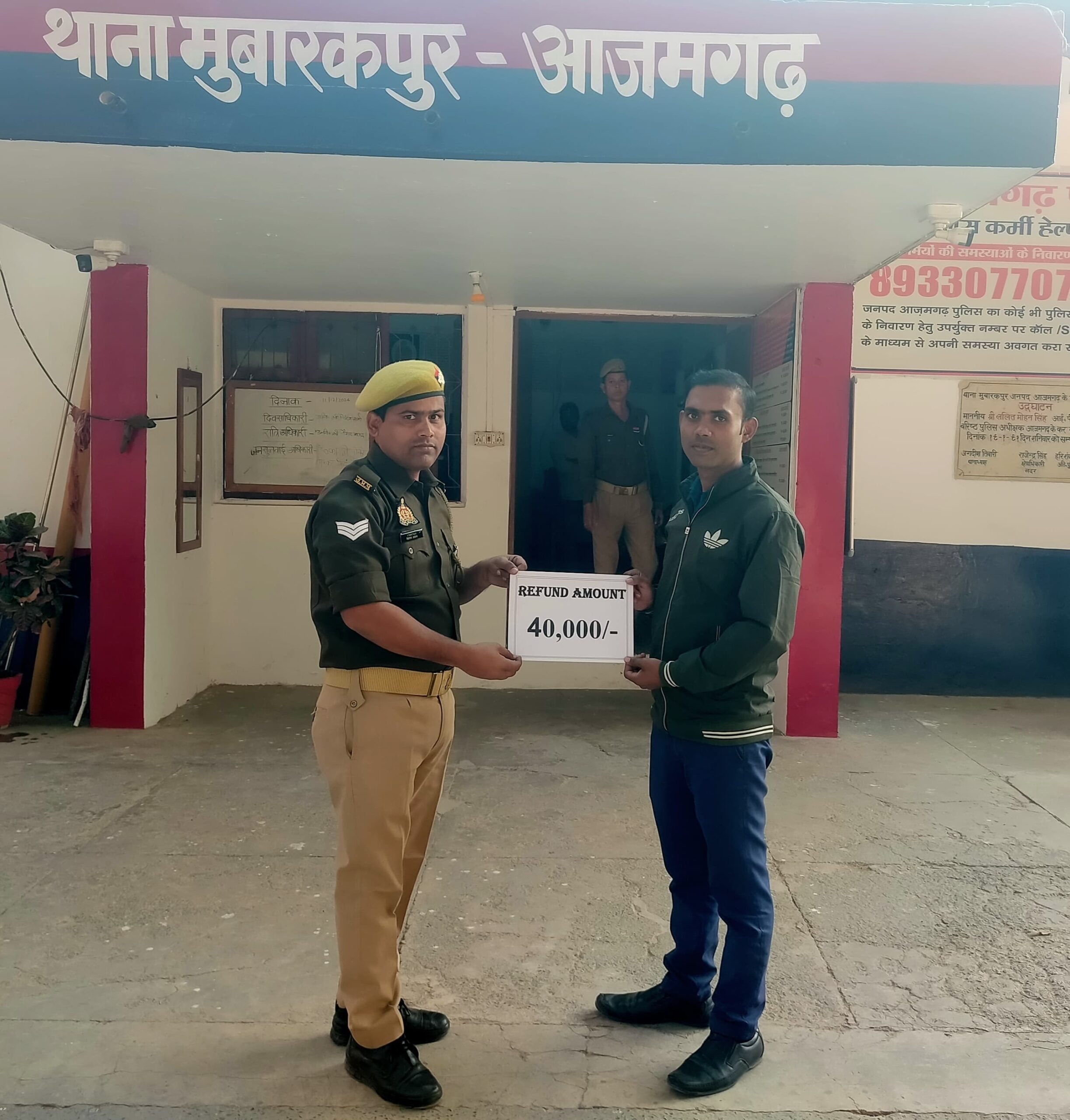 मुबारकपुर आजमगढ़ दिनांक 23.07.2024 को आवेदक श्री वीरेन्द्र प्रजापति पुत्र सुरेश प्रजापति निवासी ग्राम अमिलो थाना मुबारकपुर जनपद आजमगढ से मास्टर ट्रस्ट एप के माध्यम से शेयर मार्केट मे इनवेस्ट कराने के नाम पर कुल 40,000/- रूपये का साइबर फ्रॉड हो गया था। आवेदक द्वारा उक्त घटना की सूचना थाना मुबारकपुर पर दिया गया। कम्प्यूटर ऑपरेटर मेहताब आलम द्वारा आवेदक से तत्काल साइबर हेल्पलाइन के टोल फ्री नम्बर 1930 पर कॉल कराकर कम्पलेन्ट नं0 23109240110458 दर्ज कराया गया था। उक्त प्रकरण मे जाँचोंपरान्त साइबर सेल एवं सम्बन्धित बैंक के अधिकारी से सम्पर्क कर साइबर फ्राड के माध्यम से फ्रॉड हुआ 40,000/- रूपयों के सम्बन्ध मे मा0 न्यायालय से आदेश कराते हुए HDFC BANK के नोडल अधिकारी के माध्यम से आवेदक का 40,000/- रूपया खाते मे वापस कराया गया। आवेदक अपना फ्रॉड के माध्यम से कटा हुआ रूपया वापस पाकर पुलिस का आभार व्यक्ति किया। कार्यवाही करने वाली पुलिस टीम में रि0उ0नि0 आशुतोष कुमार मौर्य थाना मुबारकपुर जनपद आजमगढकम्प्यूटर ऑपरेटर मेहताब आलम थाना मुबारकपुर जनपद आजमगढ महिला आरक्षी दीक्षा मिश्रा थाना मुबारकपुर जनपद आजमगढ शामिल थे।