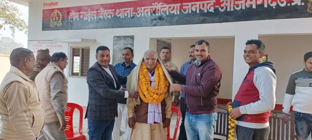 अतरौलिया आजमगढ़ क्षेत्र के गनपतपुर निवासी होमगार्ड जवान राज नारायण यादव पुत्र टेल्हू यादव जो 31 दिसंबर 2023 को अपने होमगार्ड सेवा से सेवानिवृत हो गए। उन्हें शुक्रवार को थाना परिसर में बने होमगार्ड बैरक में बीओ भीम सिंह के मौजूदगी में विदाई व सम्मान समारोह का आयोजन किया गया। जिसमें उपस्थित होमगार्ड व पुलिस के जवानों ने सेवानिवृत्ति राज नारायण यादव को अंगवस्त्र व फूल माला पहनाकर स्वागत व सम्मानित किया। स्वागत के दौरान सेवानिवृत्ति होमगार्ड राज नारायण यादव ने कहा कि 1984 से अतरौलिया थाना परिसर समेत जिला मुख्यालय पर शांति व्यवस्था ड्यूटी में अपनी महत्वपूर्ण सेवाएं देते रहे। आज लोगों द्वारा किए गए स्वागत सम्मान से बहुत ही गौरवान्वित महसूस कर रहा हूं और अपने सभी सहयोगियों होमगार्ड के लिए भगवान से प्रार्थना करेंगे की वह अपनी जिम्मेदारियो का निर्वहन अच्छे तरीके से करें, अपनी ड्यूटी पूरी ईमानदारी के साथ करें, यही उनके लिए शुभकामना है। बीओ भीम सिंह ने कहा कि आज राज नारायण यादव जी के सेवानिवृत्ति होने के पश्चात उनका स्वागत सम्मान किया गया है तथा उनके उज्जवल भविष्य की कामना करते हैं। शांति व्यवस्था ड्यूटी के दौरान कभी भी इनकी कोई शिकायत नहीं रही है। यह बड़े ही ईमानदारी के साथ अपने जिम्मेदारियां का निर्वहन करते रहे। इस मौके पर उपनिरीक्षक संतोष कुमार ,श्रील यादव, अरविंद पाल, राजेश यादव, कां0 बबलू कुमार, शिव शंकर तिवारी,रण विजय ,अमरजीत सिंह ,राधेश्याम यादव, प्रेमचंद यादव, धर्मेंद्र यादव, राधेश्याम राजभर, बृजेश तिवारी, योगेंद्र यादव, विंध्याचल यादव एवं समस्त होमगार्ड व थाना परिवार उपस्थित रहा।