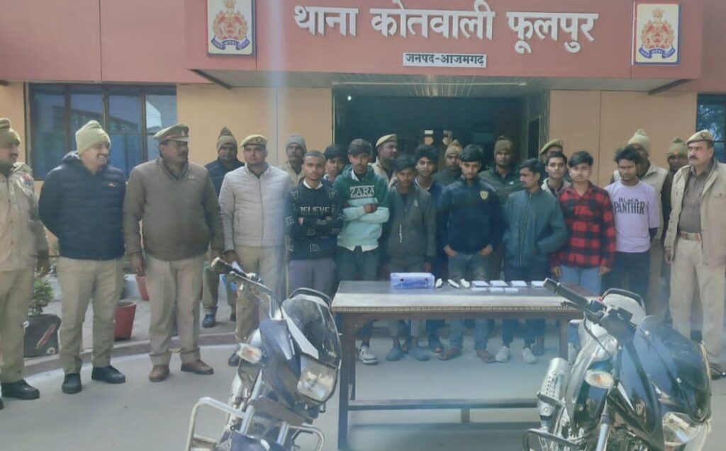 (फूलपुर) आजमगढ़ । फूलपुर पुलिस ने चोरी की 2 मोटरसाइकिल के साथ 10 अभियुक्तों गोविन्द यादव पुत्र विनोद यादव निवासी ग्राम चंदवा बहदपुर थाना सरायमीर, सुरज गौतम पुत्र अच्छेलाल गौतम निवासी ग्राम बखरा थाना सरायमीर, सौरभ गौतम उर्फ गोलू पुत्र मदन लाल गौतम निवासी ग्राम शेखवलिया थाना फूलपुर, अर्पित मौर्या पुत्र सुरेश मौर्या निवासी ग्राम खुरासो थाना फूलपुर, बुधांकुर पुत्र रामफेर निवासी ग्राम शेखवलिया थाना फूलपुर, किशन यादव पुत्र तिलकधारी यादव निवासी ग्राम बस्ती थाना सरायमीर, लालू प्रसाद यादव पुत्र अर्जून यादव निवासी ग्राम सिकरौर सहबरी थाना सरायमीर, आलोक यादव पुत्र रमेश यादव निवासी ग्राम चदवां बहदपुर थाना सरायमीर, स्वाभीमान गौतम पुत्र मटरु निवासी ग्राम बखरा थाना सरायमीर, आयुष कुमार पुत्र मनोज कुमार निवासी ग्राम शेखवलिया थाना फूलपुर जिला आजमगढ़ शामिल है । इनके पास से पुलिस ने चोरी की 02 मोटरसाइकिल, अवैध 1 तमंचा व 2 जिन्दा कारतूस 315 बोर व 3 चाकू बरामद किया है ।