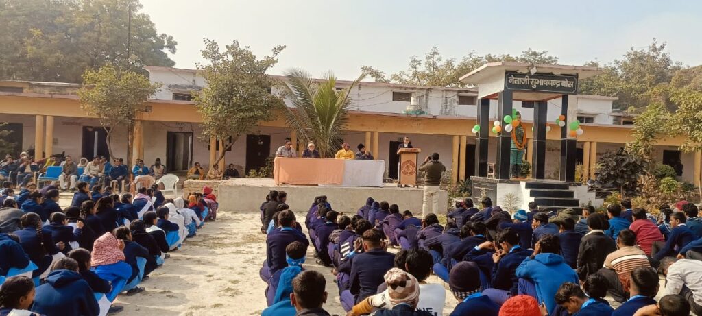 लालगंज (आजमगढ़ ) नगर पंचायत के श्रीकृष्ण गीता राष्ट्रीय इण्टर कालेज लालगंज में प्रधानाचार्य सर्वेश मिश्रा के नेतृत्व मे विद्यालय मे नेता जी सुभाषचन्द्र बोस की आदमकद की प्रतिमा पर माल्यार्पण व पुष्प अर्पित कर जयन्ती मनाई गई । कार्यक्रम के मुख्यअतिथि वरिष्ठ अधिवक्ता समर बहादुर सिंह ने कार्यक्रम को सम्बोधित करते हुए कहा कि हम ऐसे महा पुरुष की जयन्ती के अवसर पर उपस्थित हुए है कि जिनके लिए कुछ भी कहा जाय कम है। नेताजी के 128 जयन्ती मनाई जा रही है। उन्होंने कहा कि नेता जी देश के महान नायक थे । जिन्होंने देश के आजादी की लड़ाई के लिए युवाओ मे जोश जगाया कहा कि तुम मुझे खून दो मै तुम्हे आजादी दूंगा। कार्यक्रम मे विद्यालय की छात्रा अन्जलि गुप्ता कक्षा 11, दिब्याशी प्रजापति 11, सुमन गौड़ 09, आचल प्रजापति 09 सहित अन्य छात्र छात्राओ ने कार्यक्रम को सम्बोधित किया । इस अवसर पर प्रधानाचार्य सर्वेश कुमार मिश्र , धीरेन्द्र सिंह , लवकुश सिंह , रामजनम , नीरज सिंह , आलोक सिंह , जामवन्त निषाद ,अरुण कुमार गिरी , राधेश्याम राजभर , अशोक यादव , अभिषेक , अन्तिम गुप्ता , विवेक , कमलेश , सुरेश, मनोज , सतीश , श्यामसुन्दर साहित अन्य लोग उपास्थित रहे। कार्यक्रम का संचालन गिरीश सिंह ने किया ।