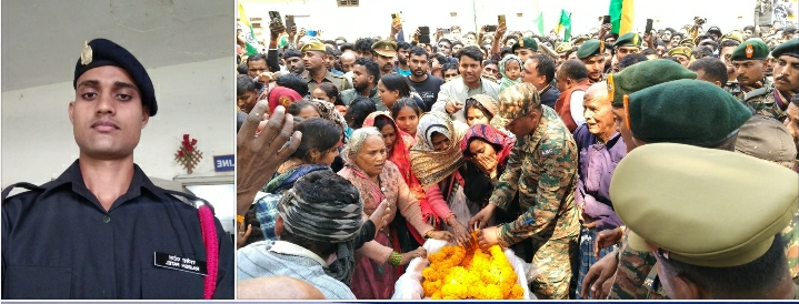 रौनापार आजमगढ़ रौनापार थाना क्षेत्र के बक्सीपुर बघावर निवासी सेना के जवान की तैनाती स्थल पर ड्यूटी के दौरान दुर्घटना में मौत हो गयी थी। सोमवार को 1:00 बजे के करीब सेना के जवान पार्थिव शरीर लेकर गांव पहुंचे। रौनापार थाना क्षेत्र के चलाकपुर से सैकड़ो की संख्या में युवा पार्थिव शरीर के साथ हाथ में तिरंगा झंडा लेकर भारत माता के जयकारे लगाते हुए घर पहुंचे। सेना के जवान का पार्थिव शरीर घर पहुंचने पर क्षेत्र के सैकड़ो की संख्या में महिला, पुरुष व बच्चे अंतिम दर्शन के लिए लालायित रहे। उप जिलाधिकारी सगड़ी नरेंद्र कुमार गंगवार, नायब तहसीलदार संजय राय, मनीष कुमार मिश्रा, राकेश कुमार सिंह, घनश्याम पटेल, जयराम सिंह पटेल, सगड़ी विधायक डॉ एच एन सिंह पटेल सहित सैकड़ो लोगों ने पुष्प अर्पित किया। सेना के जवान का पार्थिव शरीर दोहरीघाट मुक्तिधाम पर पहुंचा। जहां सेना के जवानों ने सलामी दी। पिता कोमल पटेल ने मुखाग्नि दी। राजेश पटेल पुत्र कोमल पटेल उम्र 28 वर्ष निवासी बक्शीपुर बघावर की वर्ष 2017 में एएससी बटालियन अहमदाबाद में सेना के जवान के रूप में तैनाती हुई थी जो नायक के पद पर 3 माह पूर्व जम्मू कश्मीर से स्थानांतरित होकर अहमदाबाद आए हुए थे ज़हां सेना की गाड़ी लेकर तैनाती स्थल पर जाते समय शनिवार को दुर्घटना में मौत हो गई। इसके पश्चात सेना के उच्च अधिकारियों के द्वारा उनके परिवार को सूचित किया गया और उसके बाद जवान के पार्थिव शरीर को लेकर सेना के जवान बटालियन के साथ सोमवार को उनके पैतृक गांव बक्शीपुर बघवार उनके निवास स्थान पर पंहुचे। जहां जवान को सम्मान के साथ अंतिम विदाई दी गयी। उनके बड़े भाई जयराम पटेल ने बताया कि राजेश पटेल का विवाह वर्ष 2021 में कविता पुत्री जेके सिंह के साथ हुआ।अभी तक कोई पुत्र पुत्री नहीं है। वहीं जवान का पार्थिव शरीर घर पहुंचते ही उनकी माता चन्नवती देवी पत्नी कविता सहित स्वजनो का रो-रो कर बुरा हाल है। राजेश पटेल सात भाइयों में सबसे छोटे थे।