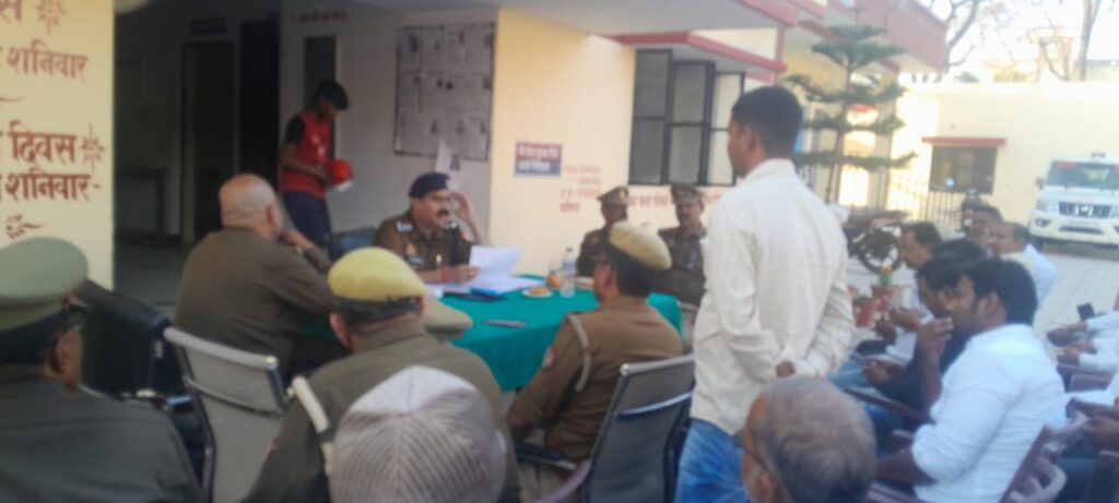 मार्टिनगंज-आजमगढ़ रविवार सांय दीदारगंज थाना परिसर में रमजान,होली, ईद के पर्व को शांतिपूर्ण ढ़ंग से मनाने को लेकर थाना क्षेत्र के ग्राम प्रधानों क्षेत्र पंचायत सदस्यों, सम्भ्रांत लोगों की गरिमामई उपस्थिती में दीदारगंज थानाध्यक्ष निरीक्षक राकेश कुमार सिंह की अध्यक्षता में शांति समिति की बैठक आहुत की गई जिसके मुख्य अतिथि पुलिस उपाधीक्षक फूलपुर अनिल कुमार वर्मा थे।मुख्य अतिथि नें बारी बारी से लोगों से बात की और कहा कि आप सभी लोग रमजान, होली, और ईद के पर्व को शांति और सौहार्दपूर्ण ढ़ंग से मनाए अगर कहीं कोई समस्या हो तो पुलिस को तत्काल सूचित करें। किसी को अगर रंग से परहेज हो तो होली के दिन घरों से न निकले। इस अवसर पर एसएसआई अनिल कुमार सिंह, एसआई नागेंद्र पांडेय, एसआई करमुल्ला अली,एसआई विनोद कुमार यादव, एसआई रमेश यादव, एसआई सुरेंद्र यादव, बृजेश पाठक, विजय बहादुर यादव,महेंद्र मौर्य, नसीम कुरैशी, साबिर हुसेन, राहुल यादव, रईस अहमद, मनीष सिंह बंटी ,हौशिला राजभर,राम अशीष यादव, भोनू प्रधान ,घनश्याम ऊर्फ दिनेश,प्रदीप कुमार आदि लोग उपस्थित थे।