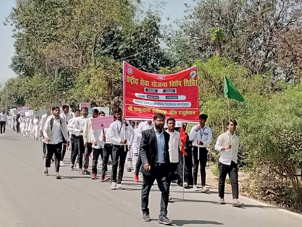 मार्टीनगंज-आजमगढ़ मार्टिनगंज तहसील क्षेत्रांतर्गत मतलूबपुर स्थित मां शकुंतला इंस्टीट्यूट आफ एजुकेशन में आयोजित राष्ट्रीय सेवा योजना शिविर के प्रथम दिन स्वयं सेवक स्वयं सेवकियों ने महाविद्यालय से हाथों में स्लोगन लिखी तख्तियां जिसपर लिखा था “मन में रखो एक ही सपना स्वच्छ बनाना है भारत अपना” “भारतीय संस्कृति की एक पुकार” स्वच्छता है हमारा अधिकार” को लेकर नारे लगाते हुए हैदराबाद स्थित शिव मंदिर पहुंचे वहां पर स्वयंसेवक व स्वयं सेविकाओं द्वारा मंदिर परिसर की साफ-सफाई की गई इसके बाद स्वयंसेविकाओं द्वारा रंगोली बनाई गई तत्पश्चात नुक्कड़ नाटक भ्रूण हत्या, दहेज कुप्रथा ,स्वच्छता अभियान आदि का मंचन किया गया इस अवसर पर प्राचार्या खुशबू राय कार्यक्रम अधिकारी स्तुति कुमार राय, राकेश कुमार, अरविंद यादव, सुबाष चंद्र प्रजापति, पूनम पाठक,ब्यूटी सिंह, सालेहा खान, प्रशांत मौर्य, हेमंत कुमार सहित स्वयंसेवक, सेविकाएं उपस्थित थे।