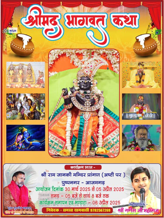 मार्टीनगंज-आजमगढ़ हिन्दू नव वर्ष चैत्र नवरात्र के प्रथम दिन 30 मार्च रविवार से पुष्पनगर स्थित श्री राम जानकी मंदिर (अष्टी) के प्रांगण में 7 दिवसीय श्रीमद्भागवत कथा का आयोजन किया गया है जो 30मार्च से 5अप्रैल शनिवार( सायं 5बजे से रात्रि 8बजे ) तक चलेगा श्रीमद्भागवत कथा के कथावाचक गणेश जी महराज (वृंदावन)होंगे। 6अप्रैल रविवार को मंदिर प्रांगण में कार्यक्रम का समापन एवम वृहद भंडारा का आयोजन किया गया है। धर्मानुरागी श्रद्धालु बंधुओं से अनुरोध है कि श्रीमद्भागवत कथा का श्रवणपान एवम भंडारा का प्रसाद ग्रहण कर अपनें जीवन को सफल बनाए। कार्य क्रम की जानकारी पुष्पनगर कल्याण समिति ने दी है।