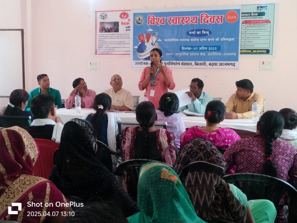 अतरौलिया आजमगढ़ ग्रामीण पुनर्निर्माण संस्थान द्वारा संचालित ग्रामीण महिला सशक्तिकरण कार्यक्रम के अंतर्गत सामुदायिक स्वास्थ्य केंद्र अतरौलिया में विश्व स्वास्थ्य दिवस के अवसर पर एक संवाद कार्यक्रम का आयोजन किया गया। इस साल की थीम “स्वस्थ शुरुआत, आशाजनक भविष्य” पर आधारित इस कार्यक्रम में मुख्य अतिथि के रूप में एसएमओ-डब्लूएचओ से डॉ. अरुणा , सभाजीत , राजा जयलाल सिंह, 100 शैय्या संयुक्त चिकित्सालय से डॉ. हमीर सिंह, सामुदायिक स्वास्थ्य केंद्र के एचईओ जितेंद्र कुमार, डॉ. अमरजीत यादव और एआरओ विशाल यादव उपस्थित रहे। राजदेव चतुर्वेदी ने बताया कि हर साल 7 अप्रैल को विश्व स्वास्थ्य दिवस के रूप में मनाया जाता है, जिसका उद्देश्य वैश्विक स्तर पर स्वास्थ्य से जुड़े महत्वपूर्ण मुद्दों और सेहत से जुड़े अधिकारों के बारे में जागरूकता बढ़ाना है। जितेंद्र कुमार ने जोर देकर कहा कि व्यक्तिगत स्वास्थ्य के साथ-साथ मानसिक स्वास्थ्य भी महत्वपूर्ण है और हमें दोनों पर ध्यान देने की आवश्यकता है। नवजात शिशुओं को जन्म के तुरंत बाद बीसीजी का टीका लगवाना चाहिए ताकि वे टीबी रोग से बच सकें। डॉ. अमरजीत यादव ने बताया कि 7 अप्रैल 1948 को विश्व स्वास्थ्य संगठन की स्थापना की गई थी, जिसका उद्देश्य गर्भावस्था, सुरक्षित प्रसव और प्रसव पश्चात देखभाल के समय उच्च गुणवत्ता वाली सेवाओं की आवश्यकता पर जोर देना है। डॉ. अरुणा ने कहा कि स्वास्थ्य विभाग महिला सशक्तिकरण को महिलाओं के स्वास्थ्य और कल्याण को बेहतर बनाने के लिए एक महत्वपूर्ण रणनीति के रूप में देखता है, जिससे वे समाज में सक्रिय भूमिका निभा सकें। कार्यक्रम में में ग्रामीण महिला सशक्तिकरण कार्यक्रम से जुड़ी 86 महिलाओं एवं 14 एएनएम व स्वास्थ्य विभाग के पदाधिकारियों ने प्रतिभाग किया । कार्यक्रम के अंत में डॉ. अरुणा को भारतीय संविधान की उद्देशिका भेंट की गई।