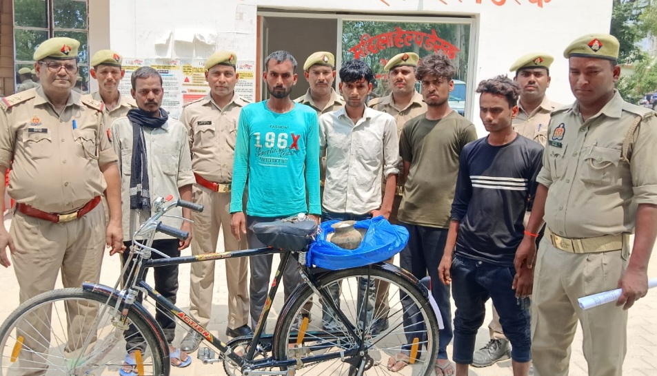 (अतरौलिया) आजमगढ़ । स्थानीय पुलिस ने चोरी के सामान के साथ 5 अभियुक्तों को गिरफ्तार किया है । इनके पास से साइकिल, पायल,1 लाकेट व 2 थाली बरामद किया है । 22 जून को पीड़िता सर्वेश पुत्री सूर्यभान राजभर निवासी भगवानपुर थाना अतरौलिया ने थाना स्थानीय पर शिकायत किया गया था कि वादिनी के भाई जशराज पुत्र सूर्यभान राजभर व अन्य व्यक्तियों ने मिलकर घर में रखा सामान चोरी कर लिये तथा बेचकर शराब पी गये, जिसके सम्बन्ध में थाना स्थानीय पर मु0अ0सं0- 228/24 धारा 457/380 भादवि0 बनाम 1.यशराज पुत्र सूर्यभान राजभर निवासी भगवानपुर थाना अतरौलिया, 2. अन्य नाम पता अज्ञात के विरुद्ध पंजीकृत कर विवेचना प्रारम्भ किया गया। विवेचना के दौरान मुकदमा उपरोक्त में अभियुक्तों 1. मुकेश निषाद पुत्र राधेश्याम निवासी भदेवा थाना अतरौलिया, 2. दिनेश निषाद पुत्र सुग्रीम निषाद निवासी भदेवा थाना अतरौलिया, 3. श्रवन पुत्र राधेश्याम निवासी भदेवा थाना अतरौलिया, 4. रवि कन्नौजिया पुत्र मूलचन्द कन्नौजिया निवासी भदेवा थाना अतरौलिया जनपद आजमगढ़ का नाम प्रकाश में आया। सोमवार को उ0नि0 जफर अयूब मय हमराह द्वारा मुकदमा उपरोक्त से सम्बन्धित अभियुक्त जशराज पुत्र सूर्यभान निवासी भगवानपुर थाना अतरौलिया आजमगढ़ को सेल्हरापट्टी अंडरपास से समय करीब 04.25 बजे चोरी की साईकिल के साथ गिरफ्तार किया गया । गिरफ्तार अभियुक्त की निशादेही पर मुकदमा उपरोक्त में प्रकाश मे आये अभियुक्तो 1. मुकेश निषाद, 2. दिनेश निषाद, 3. श्रवन, 4. रवि कन्नौजिया को चोरी के सामान के साथ गिरफ्तार लिया ।