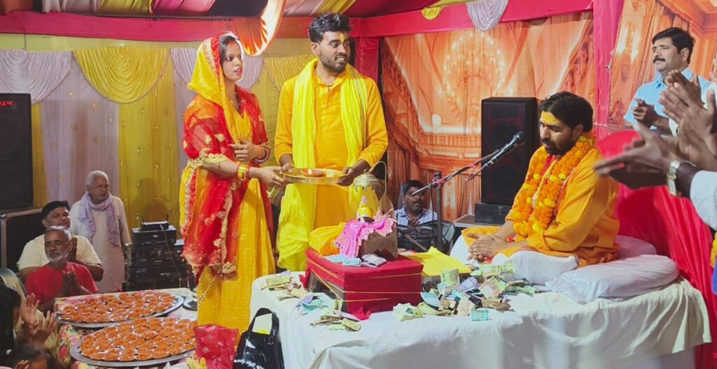 अतरौलिया आजमगढ़ पूरब पोखरा रोड पर अग्रहरि परिवार द्वारा आयोजित संगीतमयी श्रीमद् भागवत कथा के सातवें व आखिरी दिन हज़ारों की संख्या में श्रद्धालु महिला/पुरुष कथा स्थल पर पहुंचे। भागवत कथा के सातवें दिन व आखिरी दिन की कथा पंचपेड़वा आश्रम के भागवताचार्य पंडित चंद्रेश दास जी महाराज द्वारा सुदामा चरित्र वह भगवान की अन्य लीलाओं का बहुत ही भव्य तरीके से वर्णन किया गया। भागवताचार्य पंडित चंद्रेश दास जी महाराज ने बताया कि कथा में विश्राम दिवस की कथा के साथ सुदामा चरित्र की कथा सुनाई गई और भगवान की अन्य लीलाओं का भी वर्णन हुआ। उन्होंने कहा कि विगत 7 दिनों से यह कथा चल रही है,। 18 अप्रैल से कलश यात्रा के साथ कथा का प्रारंभ हुआ। नगर तथा क्षेत्रवासी कथा में हजारों की संख्या में भाग लिए, भक्ति व सनातन धर्म की लोकप्रियता को देखते हुए सभी लोग जुड़ रहे हैं जिससे पूरा वातावरण भक्तिमय हो गया। लगभग 5 हज़ार से अधिक संख्या में लोग शुक्रवार को विशाल भंडारे में प्रसाद ग्रहण करेंगे । कथा के आयोजक अनिल कुमार अग्रहरी ने बताया कि पंडित चंद्रेश जी महाराज के श्रीमुख से यह कथा हो रही है। कथा के आखिरी दिन अपार भीड़ हुई जिसमें हजारों की संख्या में लोग एकत्रित हुए। शुक्रवार को होने वाले विशाल भंडारे में अधिक से अधिक लोग पहुंचकर प्रसाद ग्रहण करें। नीरज तिवारी ने कहा कि लगातार एक सप्ताह से यह श्रीमद् भागवत कथा चल रही है। कथा के आखिरी दिन भगवान श्री कृष्ण की सुंदर झांकी निकाली जाएगी। नगर व ग्राम वासी इस भव्य आयोजन में हिस्सा लेकर पुण्य के भागीदार बने और भंडारे में प्रसाद ग्रहण करें। इस मौके पर सैकड़ो की संख्या में श्रद्धालुओं ने श्रीमद् भागवत कथा का अनुसरण किया और प्रसाद ग्रहण कर पुण्य के भागीदार बने।