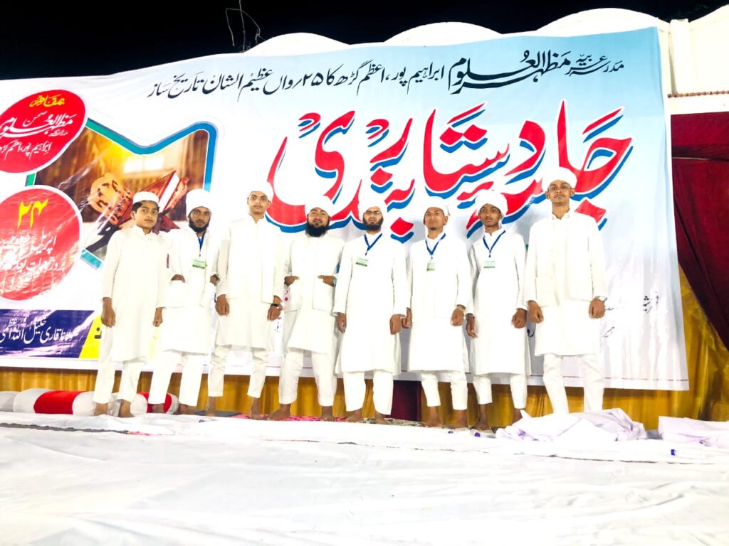 मुबारकपुर आजमगढ़ जामिया अरबिया मदरसा मजहरूल ओलूम के परिसर में जलसे दस्तारबन्दी का आयोजन हुआ जिसमें मदरसा के फारगीन छात्र हाफिज कुरान की उपाधि से सम्मानित कुल 85बच्चों को दस्तार बांधी गई। मुबारकपुर थाना क्षेत्र के ग्राम इब्राहीमपुर में विगत बीती रात में जामिया अरबिया मदरसा मजहरूल ओलूम के परिसर में वार्षिक 25 वां जलाए दस्तकार बन्दी का कार्यक्रम सम्पन्न हुआ। हज़रत मौलाना कारी होजैफा अजीज ने तिलावते कुरआन पाक से कार्यक्रम का आगाज किया। हज़रत मौलाना महमूद अहमद बलिलयावी ने नात पाक का नजराना पेश किया । हज़रत मौलाना मुफ्ती राशीद साहब ने कुरान पाक की तालीम हासिल करने और तिलावत कुरान पाक की महत्ता पर प्रकाश डाला। उन्होंने कहा कि मदरसा मजहरूल ओलूम स्थानीय व बैरूनी बच्चों को तालीम शिक्षा देता है। बड़े ही हर्ष का विषय है कि यहां से शिक्षा प्राप्त कर 85छात्रों को हाफिज कुरान की उपाधि से सम्मानित करते हुए उनके सर पर दस्तार बांधी गई है। अध्यक्षता हज़रत मौलाना तौफीक अहमद और संचालन हज़रत मौलाना अब्दुर्रहमान ने किया।इस अवसर पर मुख्य रूप से सम्मानित छात्र उमर सलीम, अब्दुर्रब, मुहम्मद सद्दाम , अब्दुर्रहमान सहित तमाम लोग का नाम शामिल हैं।