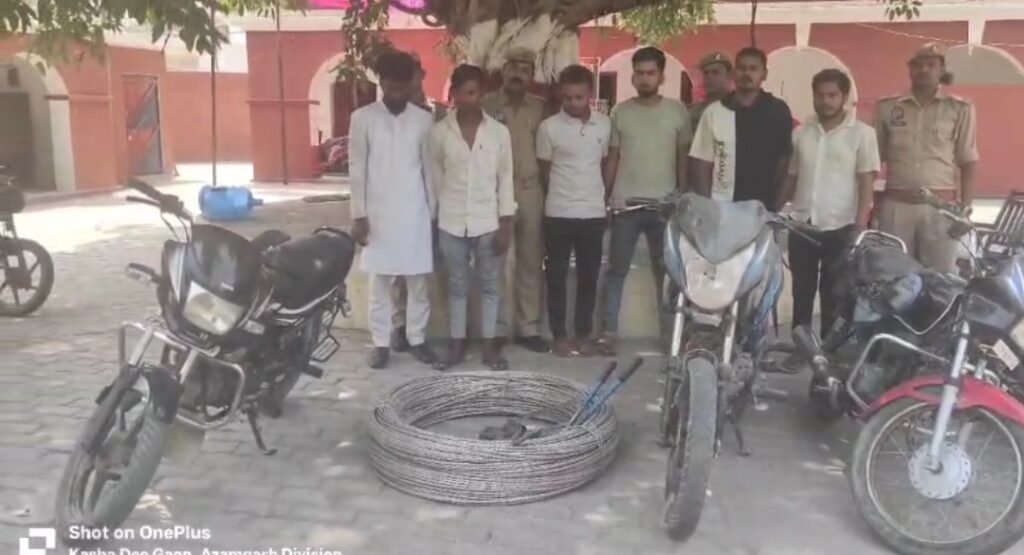 (लालगंज) आजमगढ । वरिष्ठ पुलिस अधीक्षक हेमराज मीना, द्वारा चलाए जा रहे अपराधियों के विरूद्ध अभियान के तहत के थाना देवगांव की पुलिस टीम द्वारा चोरी के कुल 9 अभियोगों का सफल अनावरण करते हुए लालगंज लहुआं रोड साई आईटीआई इस्टिट्यूट के पास से समय करीब 10.00 बजे चोरी करने वाले शिवाजी उर्फ चर्चीतनाथ पुत्र शोभनाथ ग्राम बधौना थाना मेंहनाजपुर, देवा उर्फ विपिन पुत्र राजेन्द्र निवासी ग्राम चिल्लुपुर थाना मेंहनाजपुर जनपद आजमगढ़, आनन्द उर्फ मुलायम पुत्र अनिल राम निवासी करसड़ा थाना मेंहनाजपुर जनपद आजमगढ़, प्रत्यांशु सिंह उर्फ भोला सिंह पुत्र रणविजय सिंह निवासी बेला थाना मेहनाजपुर जनपद आजमगढ़, अभिषेक कुमार पुत्र चन्द्रबली राम निवासी हैबतपुर डुभाव थाना तरवां जनपद आजमगढ़, गोपी यादव पुत्र राधेश्याम यादव निवासी पवनी खुर्द थाना मेंहनगर जनपद आजमगढ़ को गिरफ्तार किया है । इनके कब्जे से चोरी के 5 मोटरसाइकिल, 3 मोबाइल, 1 तमन्चा व 1 कारतूस .315 बोर, डीजे का टुटा हुआ लाईट व एक रोड लाईट, दो टुटा स्पीकर व 21350 रू0 के बरामद किया है । पूछताछ में गिरफ्तार अभियुक्तों द्वारा बताया गया कि हम लोग मिलकर आस-पास चोरी करते हैं, हम लोगों के पास से जो सामान बरामद हुआ है, वह सब चोरी का है।