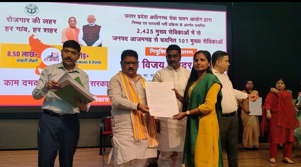 आजमगढ़ । मुख्यमंत्री, उ0प्र0 योगी आदित्यनाथ जी ने आज लखनऊ से उत्तर प्रदेश अधीनस्थ सेवा चयन आयोग द्वारा निष्पक्ष एवं पारदर्शी भर्ती प्रक्रिया के अन्तर्गत नव चयनित बाल विकास सेवा एवं पुष्टाहार विभाग की 2425 मुख्य सेविकाओं एवं 13 फार्मासिस्ट को नियुक्ति पत्र का वितरण किया। उक्त कार्यक्रम का सजीव प्रसारण विधान परिषद सदस्य विजय बहादुर पाठक की उपस्थिति में हरिऔध कला केन्द्र आजमगढ़ में किया गया। इसी क्रम में विधान परिषद सदस्य ने उत्तर प्रदेश अधीनस्थ सेवा चयन आयोग द्वारा निष्पक्ष एवं पारदर्शी भर्ती प्रक्रिया के अन्तर्गत जनपद की चयनित 101 मुख्य सेविकाओं में से 100 मुख्य सेविकाओं को नियुक्ति पत्र का वितरण किया। 01 मुख्य सेविका को मा0 मुख्यमंत्री जी द्वारा लखनऊ में नियुक्ति पत्र का वितरण किया गया। विधान परिषद सदस्य ने जनपद की नव चयनित समस्त मुख्य सेविकाओं को बधाई एवं शुभकामनाएं दी। उन्होने कहा कि इस भर्ती में अयोध्या के बाद आजमगढ़ में सर्वाधिक मुख्य सेविकाओं का चयन हुआ है, यह आजमगढ़ के लिए गर्व का विषय है। उन्होने कहा कि मा0 मुख्यमंत्री जी ने आजमगढ़ का छवि/स्वरूप ही बदल दिया है। आजमगढ़ के लोग आज हर क्षेत्र में अपना नाम कमा रहे हैं। उन्होने कहा कि मा0 मुख्यमंत्री जी ने अपने सम्बोधन में आपके दायित्व का भी बोध कराया है, जिसमें कहा कि जब कृष्ण की चर्चा होगी, तब मॉ यशोदा की भी चर्चा होगी। उन्होने कहा कि मा0 प्रधानमंत्री जी का नारी सशक्तीकरण पर जोर है, राजनैतिक क्षेत्र में महिलाओं की भागीदारी बढ़े, इसलिए लोकसभा में उनके लिए 30 प्रतिशत आरक्षण का प्राविधान किया जा रहा है। उन्होने कहा कि जब एक नारी सशक्त होती है, तो एक परिवार सशक्त होता है। उन्होने कहा कि हमारी सरकार पूरी निष्पक्ष एवं पारदर्शी तरीके से समस्त भर्तियां करा रही हैं। विधान परिषद सदस्य ने कहा कि मुख्य सेविकाओं को आंगनवाड़ी कार्यकत्रियों के साथ समन्वय बनाना है, और अपने काम का अनुश्रवण करते हुए सरकार की मंशा के अनुसार कार्य करना है। उन्होने कहा कि शासन की मंशा है कि प्री प्राइमरी स्कूल के बच्चों को आंगनवाड़ी केन्द्र के बच्चों को शिक्षित किया जाए। इसके लिए शासन स्तर से प्रदेश में कुल 5000 विद्यालय चिन्हित किये गये हैं। उन्होने कहा कि आने वाले समय में नई तकनीक के माध्यम से आपको सशक्त करते हुए एक अच्छी व्यवस्था आंगनवाड़ी केन्द्रों की स्थापित करेंगे। उन्होने कहा कि आने वाले 06 महीनों में बहुत ही महत्वपूर्ण कार्य किया जाना प्रस्तावित है, जिसमें सबसे महत्वपूर्ण बाल वाटिका है। जो विद्यालय एक किमी की परिधि में हैं, उनमें बाल वाटिका स्थापित की जायेंगी। सरकार की मंशा है कि हर जगह आंगनवाड़ी केन्द्र बने, जहां पर नहीं बने हैं, वहां के लिए प्रस्ता