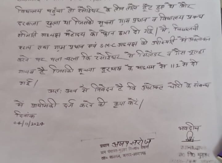 फरिहा आजमगढ़ गंभीरपुर थाना क्षेत्र एवं शिक्षा क्षेत्र ठेकमा के प्राथमिक विद्यालय मुड़हर में अज्ञात चोर रसोईघर...